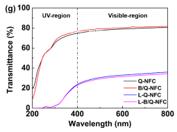 针对以上突出问题,团队分别以漂白硫酸盐竹浆和未漂白高得率竹浆为原料,利用木质素组分作为成碳剂,通过化学预处理在纤维素表面引入季铵盐基团,机械分离出高度纳纤化的低木质素含量(<1wt%)的Q-NFC和高木质素含量(19wt%)的L-Q-NFC,然后经硼化改性策略制备出兼具阻燃抑烟功能的B/Q-NFC和L-B/Q-NFC材料。后硼化改性的NFC薄膜很好地保留NFC膜原有的透光性,而木质素组分存在虽然降低了NFC膜的透光性,但赋予其紫外屏蔽功能。