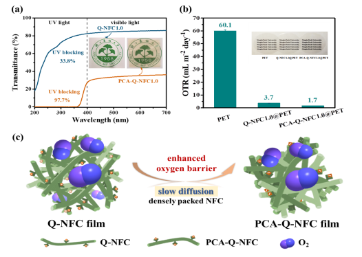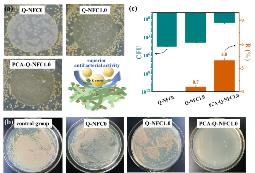 针对以上突出问题,刘宏治团队在季铵盐预处理过程中,将具有抗菌和抗氧化活性的4-香豆酸(PCA)通过简便的“阴离子交换”策略锚定在Q-NFC纤维表面。结果显示,通过非共价键引入源自天然资源的PCA阴离子后,不仅赋予了Q-NFC优异的紫外屏蔽功能和非溶出型抑菌效果,而且改性薄膜对金黄色葡萄球菌的抑菌率显著提升,并显示出更佳的体外细胞存活率和阻氧性能。此外,其它天然酚酸也被尝试,证明了该功能化改性策略的普适性。目前,该多功能化Q-NFC材料在食品保鲜和医用材料领域的应用正在进行。以上成果发表在ACS Sustainable Chemistry & Engineering2021, 9, 15755(IF=8.198,JCR二区)上。论文的第一作者为浙江农林大学硕士生茹静和永利yl23411官网入口王章慧讲师,通讯作者为永利yl23411官网入口刘宏治教授和宁波李惠利医疗中心彭兆祥主任医师。