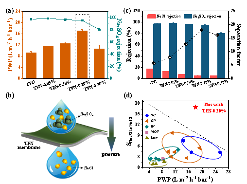 膜分离作为一种节能高效的新型分离技术,广泛应用于污水处理、海水淡化等领域。然而,现有聚酰胺(PA)纳滤膜主要存在着渗透性-选择性trade-off效应以及膜易污染的突出问题。为此,团队将磷酸酯化改性的P-CNF原位引入至PA基质中,制备出高性能的薄层纳米复合(TFN)纳滤膜。研究表明,引入P-CNF后,纳滤膜纯水渗透通量和Na2SO4截留率均得以提升,突破了渗透性-选择性之间的“trade-off”效应。得益于高Na2SO4截留率和低NaCl截留率,该纳滤膜表现出高达18.0的分离系数,远高于目前文献中报道的TFN纳滤膜。以上成果发表在Journal of Membrane Science2022,647,120339(IF=8.742,JCR一区)上。论文的第一作者和通讯作者为王章慧讲师,通讯作者为刘宏治教授和浙江大学朱利平教授。
