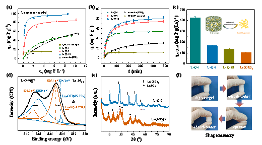 针对这一问题,团队选择具有大孔形貌的Q-CNF气凝胶为载体,提高了La(OH)3纳米棒在载体内部的负载量和分布均匀性,得到了负载纳米La(OH)3的Q-CNF杂化气凝胶(即L-Q气凝胶)。在大孔气凝胶和高负载量La(OH)3的协同作用下,L-Q气凝胶对磷酸盐最大吸附容量高达87.0 mg P g-1,吸附速率为粉末状纳米La(OH)3的3倍,其La的利用率也远优于纳米La(OH)3;经多次吸附-解吸附循环,该气凝胶吸附容量保持稳定,经简单碱洗即可再生;研究分析表明,吸附机理为配体交换和形成LaPO4沉淀。以上成果发表在Chemical Engineering Journal2022,433,134439(IF=13.273,JCR一区)上。论文的第一作者为王章慧讲师,通讯作者为刘宏治教授。