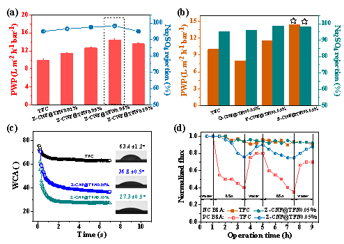 为了同时解决渗透率-选择性相互制约和PA膜易污染的问题,团队进一步提出CNF和两性离子协同调控膜结构的新思路。首先,基于“两步预处理改性法”合成了表面接枝磷酸酯和季铵盐基团的两性离子CNF(Z-CNF),然后通过界面聚合法将其原位引入至PA基质内。引入Z-CNF后,纳滤膜的纯水渗透通量和Na2SO4截留率分别高达14.4 L m-2h-1bar-1和98.3%,实现了纳滤膜的渗透性和选择性的同步提升。在相同纳米材料添加量下(0.05%),Z-CNF@TFN膜的渗透选择性明显优于Q-CNF@TFN膜和P-CNF@TFN膜,表明超亲水两性基团引入有效提高了PA膜的渗透选择性。此外,使用BSA对膜进行污染,发现相比于PA膜,Z-CNF@TFN膜对于负电BSA和正电BSA均表现出较低的通量下降率和高的通量恢复率,显示优异的抗污性能。以上成果发表在Desalination2022,521,115397(IF=9.501, JCR一区)上。论文的第一作者为团队本科生夏道伟,通讯作者为王章慧讲师、刘宏治教授及浙江大学朱利平教授。