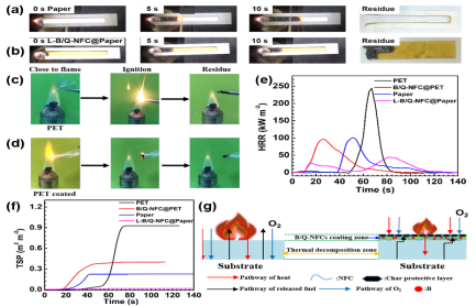 此外,硼化改性的NFC膜表现出良好成碳能力,B/Q-NFC和L-B/Q-NFC膜的成碳量分别达到37wt%和42wt%。锥形量热仪结果发现,接枝硼元素与木质素组分产生了高效协同阻燃抑烟效果,其热释放速率和总热释放速率分别较L-Q-NFC降低了80%和60%,释放的有毒烟雾减少了近99%。机理分析认为,燃烧初期涂覆的NFC阻燃层可以有效阻碍氧气以及热量从外部向基底的扩散。由于优异的成碳性能,基底表面随即被致密有序碳层覆盖,从而进一步阻止内部基底因高温所产生可燃气体的外逸。