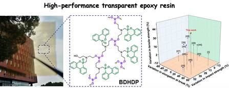 公司团队设计合成的两款阻燃剂因其磷-硼协同阻燃效应,能够在低添加量下(≤ 3wt%)赋予环氧树脂优异的阻燃及抑烟性能(极限氧指数> 31%,UL-94 V-0级,总烟释放量降低约20%)。同时,低聚物型阻燃剂的加入显著提升了环氧树脂的力学强度及韧性,并且保持其透光性。这两项工作提供了一种合成多功能含磷阻燃剂的有效策略,可用于制备高性能火安全环氧树脂,在电子电气、交通和建筑等领域具有潜在的应用前景。