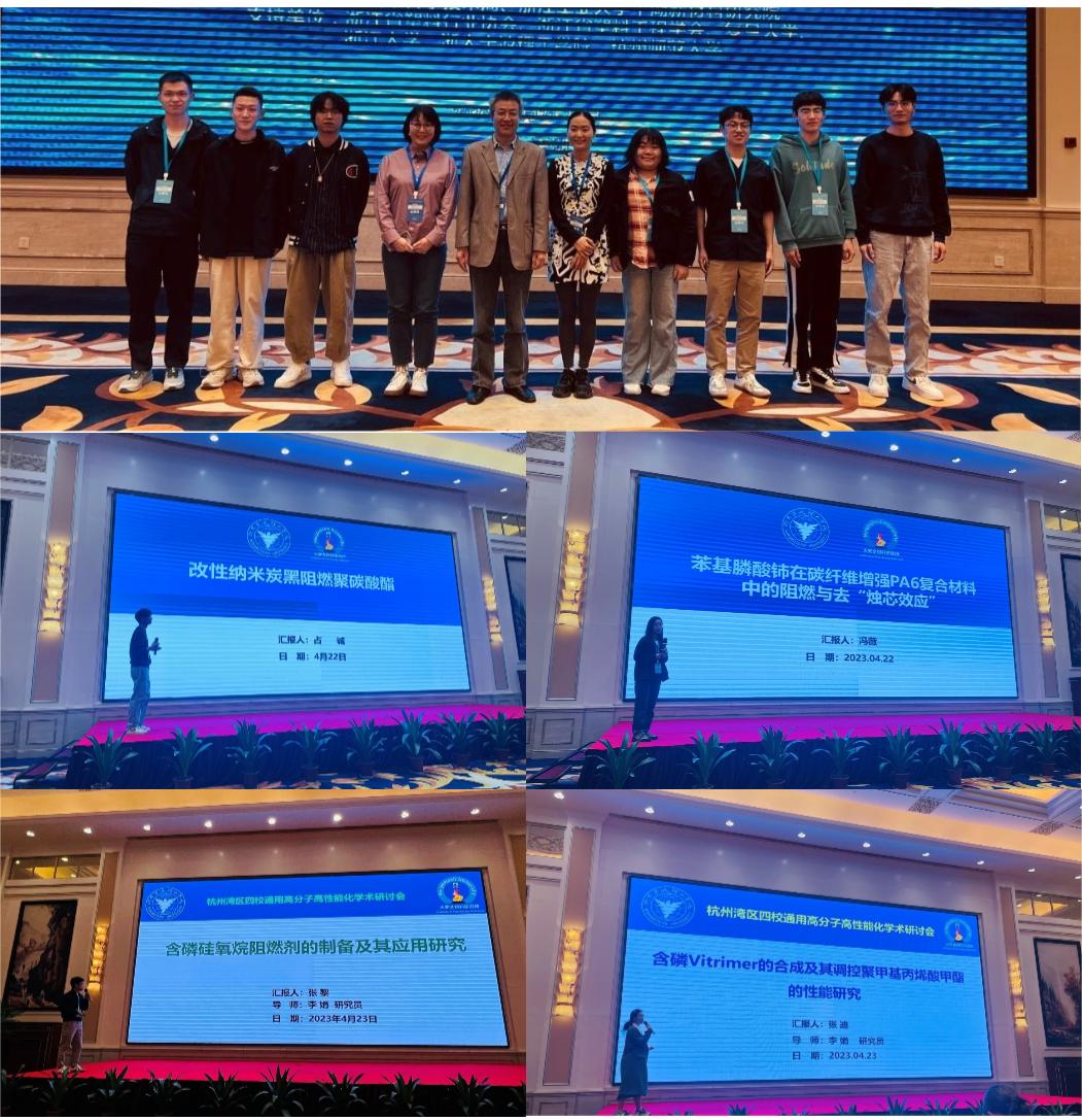 永利yl23411官网火安全材料团队方征平教授、李娟研究员、郭正虹教授参加了此次会议,冯薇、占诚、张黎和张迪四位研究生分别分享了《苯基膦酸铈在碳纤维增强PA6复合材料中的阻燃与去“烛芯效应”》、《改性纳米炭黑阻燃聚碳酸酯》、《含磷硅氧烷阻燃剂的制备及其应用研究》和《含磷Vitrimer的合成及其调控聚甲基丙烯酸甲酯的性能研究》等精彩的学术报告。