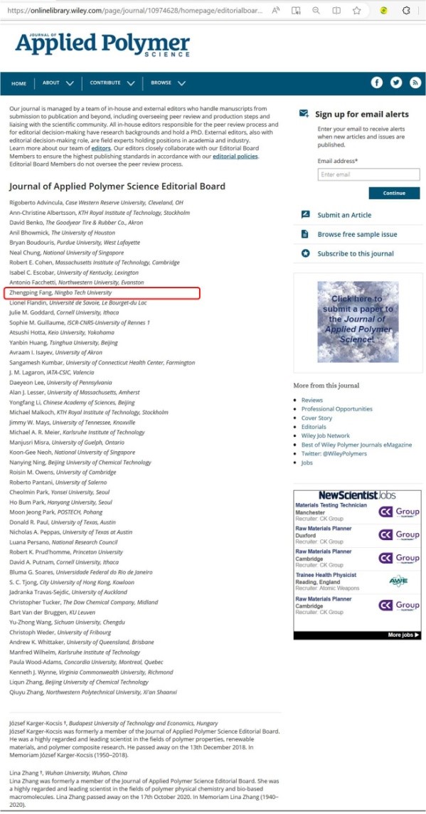 近日,公司经理方征平教授应邀担任Journal of Applied Polymer Science(浙江大学TOP期刊,JCR二区)编委,该刊物是Wiley出版集团旗下的老牌SCI收录期刊,发文量和引文量长期高居高分子科学第一位。目前担任该刊物编委的中国学者共6人,包括中国科公司化学研究所李永舫院士,四川大学王玉忠院士、华南理工大学张立群院士,清华大学黄延宾教授和西北工业大学张秋禹教授。