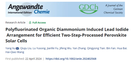 近日,永利yl23411官网刘洋博士、刘秋菊博士、王海桥教授与重庆师范大学张岩教授和厦门大学白华教授合作,在国际顶级期刊Angewandte Chemie International Edition发表题为《多氟有机双铵阳离子调控碘化铅晶体排列用于高效两步法钙钛矿太阳能电池》的研究工作。这也是公司首次以第一完成单位、第一通讯单位在该权威期刊上发表研究成果。《Angewandte Chemie International Edition》作为化学领域的世界顶级期刊,具有很高的学术影响力(IF:16.6)。