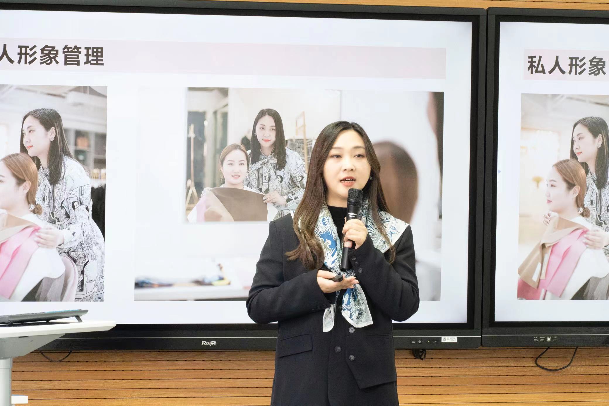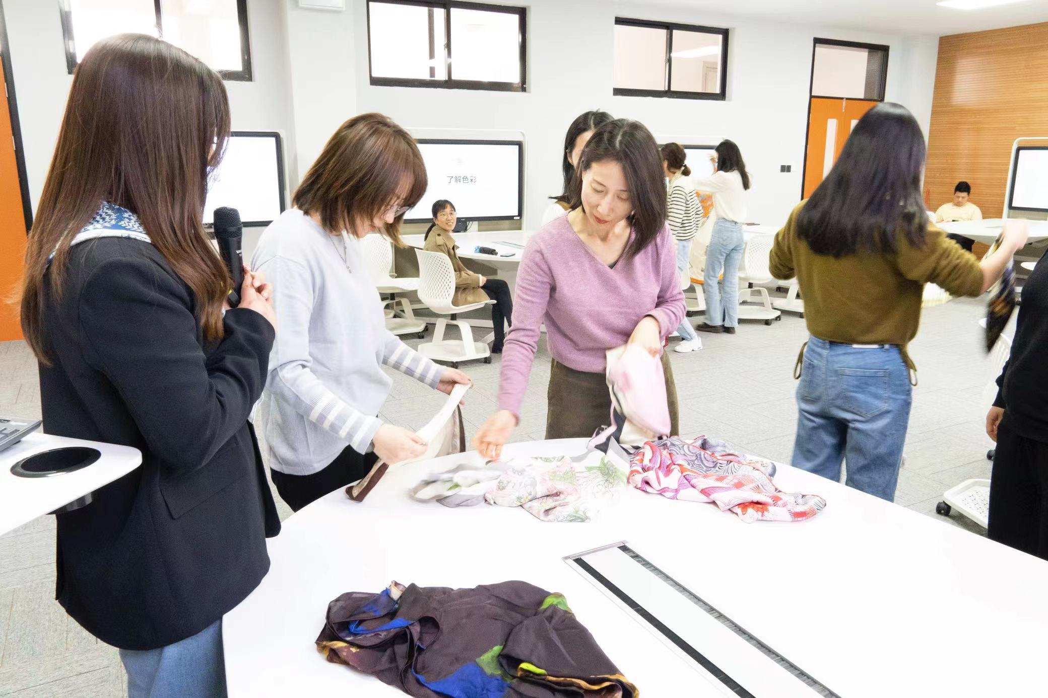 王慧敏老师首先通过介绍一些知名人物的形象塑造,强调了日常形象设计的重要性,然后从视觉形象管理、社交形象管理、精神形象管理三个方面深入浅出地阐释形象管理的具体内涵,并介绍不同类型形象管理的实用技巧。随后,王老师重点从脸型特征、肤色特征、身形特征等细节带领女老师们进一步了解自己的形象特点,并通过挑选丝巾搭配服装的互动活动来展示日常穿搭的实践技巧,帮助大家取长补短,发挥形象优势,提升自身魅力。活动在女老师们热烈的讨论与热情的互动中落下帷幕,大家纷纷表示在这次形象设计沙龙中受益匪浅,对日常形象管理也有了更深刻的体会。