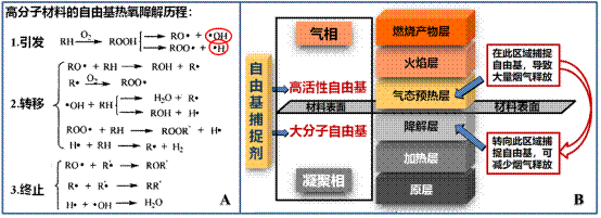 高分子材料自由基热降解历程(A)和“气相-凝聚相转移自由基捕捉”示意图(B).