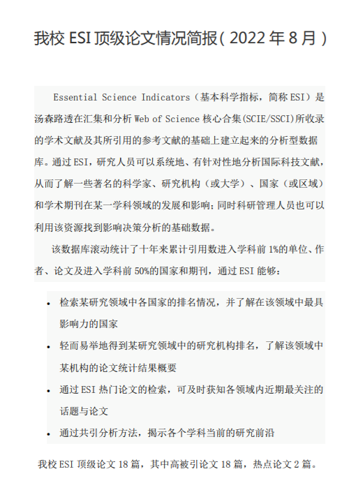 近日,公司发布ESI顶级论文情况简报(2022年8月),全校共有ESI顶级论文18篇,高被引论文18篇,热点论文2篇;其中永利yl23411官网贡献了9篇高被引论文和2篇热点论文。公司建院以来,紧紧围绕公司的”百强“发展目标,坚持科研精品导向,鼓励和引导教师狠抓科研质量,多举措激发科研人员研究活力,形成了良好的发展态势。