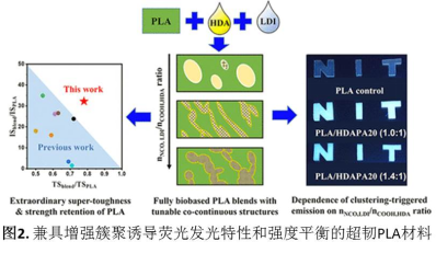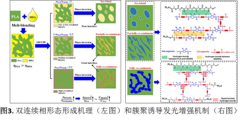 公司永利yl23411官网生物质高分子材料团队负责人刘宏治教授继2019年在高分子领域国际顶级期刊Macromolecules(2019,52,8415)上率先报道了L-赖氨酸二异氰酸酯(LDI)诱导植物油基氢化二聚酸(HDA)动态硫化增韧PLA策略后,与郑州大学永利yl23411官网刘浩副教授合作,通过调控这两种生物基单体反应性基团的当量比(nNCO,LDI/nCOOH,HDA),成功制备出兼具增强簇聚诱导荧光发光性能(CTE)和平衡力学强度(较纯PLA仅降低20%)的超韧PLA共混物(如图3所示),解决了PLA材料强度-韧性难以兼顾的矛盾,最大缺口冲击强度高达109.8 kJ×m-2(纯PLA的30.5倍);将原子力显微镜纳米力学表征技术与传统的相形态表征手段、理论模型计算相结合,阐明了该共混体系在超低交联尼龙弹性体增韧剂(HDAPA)含量下双连续相形成机理和CTE增强机制(如图4所示),并显示出该二异氰酸酯原位诱导二官能度脂肪酸单体原位动态硫化增韧策略在诱导形成双连续相形态和高效提升PLA冲击韧性方面的普适性。该工作为PLA材料力学性能-功能性一体化设计和制备提供了新的思路和理论指导,最近相关研究成果以“Diisocyanate-induced dynamic vulcanization of difunctional fatty acids toward mechanically robust PLA blends with enhanced luminescence emission”为题发表于Macromolecules2022,55, 17, 7695(浙大ZJU100期刊&中科院一区TOP期刊,IF=6.057)上。其中,材料荧光性能测试表征方面得到了钟国伦教授的帮助。此外,刘宏治教授又将该原位动态硫化增韧策略推广到植物油基二元脂肪醇(PripolÔ2033)/脂肪族二异氰酸酯(HDI)二元单体体系,同样制备出冲击韧性最高达87.1kJ×m-2(约为纯PLA的28倍)的超韧PLA材料(如图4所示)。近日,相关成果被International Journal of Biological Macromolecules期刊(IF=8.025,JCR一区TOP期刊)正式接收。