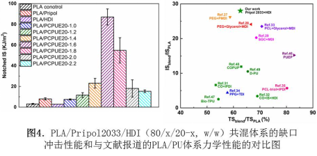 由于PLA分子链固有的刚性,其缺口冲击强度很差(仅1~3kJ×m-2),极大限制了其在汽车、电气、医学等高附加值领域的广泛应用,因此其增韧改性研究一直都是学术界和工业界的研究热点。然而,PLA与大多数聚合物增韧剂相容性欠佳,如何调控两者的相容性和微观相结构成为获得高冲击韧性PLA的关键。目前,改善相容性的方法主要包括引入合适的嵌段共聚物作为界面相容剂、添加聚合物或小分子界面改性剂、直接用环氧化弹性体作为增韧剂、加入价格昂贵的右旋PLA组分或链段在相界面构筑立构复合晶(sc-PLA)。然而,这些措施普遍存在增韧效果不理想、预合成和改性步骤复杂、需使用石油基增韧剂、增韧后易导致PLA熔体粘度显著增加以及需要后退火处理等缺点,因此亟需开发一种简便、高效且普适的改善PLA冲击韧性策略。
