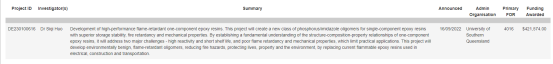 博士后霍思奇依托公司方征平教授团队在阻燃含磷环氧树脂领域进行了大量研究;针对单组份环氧树脂阻燃性能差,潜伏期短的缺陷,设计合成含磷阻燃咪唑类潜伏性固化剂,以制备兼具阻燃抑烟,长效潜伏的单组份环氧树脂。另外,为解决环氧树脂阻燃及综合性能的权衡问题,设计合成含磷低聚物型协同阻燃剂,以制备火安全-透明-强韧环氧树脂。博士后霍思奇此次获批的DECRA正是基于上述研究成果提出。