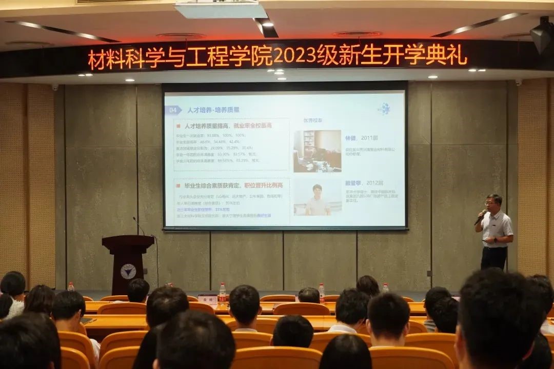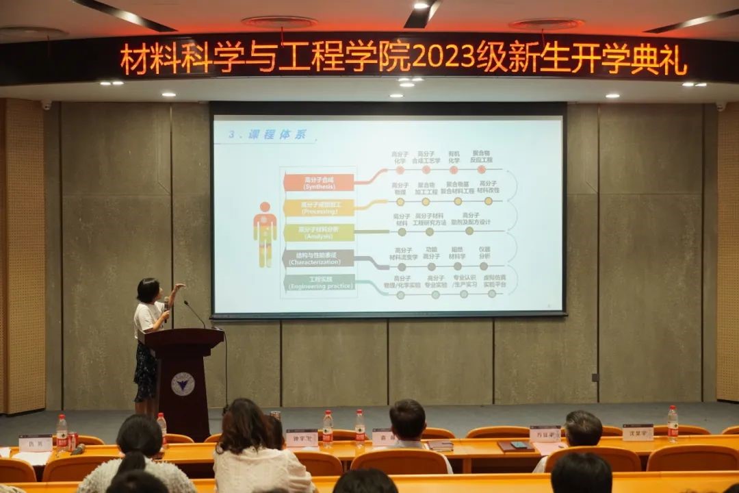 一次次倾囊相授,一次次教学相长,一茬茬薪火相传。高分子材料系主任张艳教授为各为新生介绍了高分子材料与工程这个专业,她提到高分子专业的发展势头持优,现正在努力发展国家级一流专业;之后是能源电子材料系主任王维燕教授为大家介绍了能源电子材料在生活中的应用,而且我们专业是国内首个以能源电子材料为特色的专业,团队力量丰富,为同学们提供了重要学习支持。