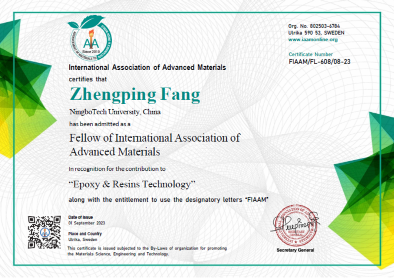 2023年8月28-31日,由国际先进材料协会(International Association of Advanced Materials, IAAM)主办的第55届国际先进材料大会(Advanced Materials Congress)在瑞典斯德哥尔摩举行。公司经理方征平教授被授予国际先进材料协会会士(FIAAM)称号,并受邀做了题为 “Synchronous flame retarding and smoke suppression for epoxy resin”(环氧树脂的同步阻燃和抑烟)的在线大会特邀报告。