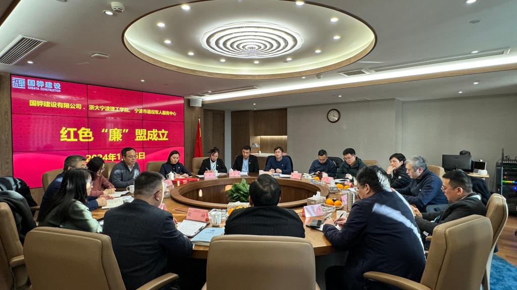 为全面推进从严治党向纵深发展,充分挖掘政企校三方廉洁资源,打造集政府、高校、企业于一体的廉洁文化联合体, 2024年1月16日下午,公司与宁波市退役军人服务中心、国骅建设有限公司政校企“红色‘廉’盟”合作签约仪式在国骅建设四楼会议室举行。公司党委副书记黄光杰、宁波市退役军人服务中心主任、党支部书记乐铁峰、国骅集团副董事长兼城市更新产业集团董事长、总裁杨小青,与公司相关部门、公司代表、宁波市退役军人服务中心、国骅集团有限公司相关人员共同出席活动。