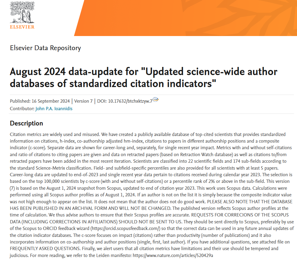 全球前2%顶尖科学家榜单由斯坦福大学John P.A.Ioannidis教授团队发布,爱思唯尔提供数据支持,该榜单基于Scopus数据库的引用数据系统分析,以被引数、H指数、HM因子等6种综合指标,通过"终身影响力"和"年度影响力"两个维度观测全球科研学者,从近700 万名科学家中遴选出世界排名前2%的科学家,分为22个领域和174个细分子领域,为科学家长期科研表现提供了一个衡量指标,能够更客观、更真实地反映科学家的影响力。