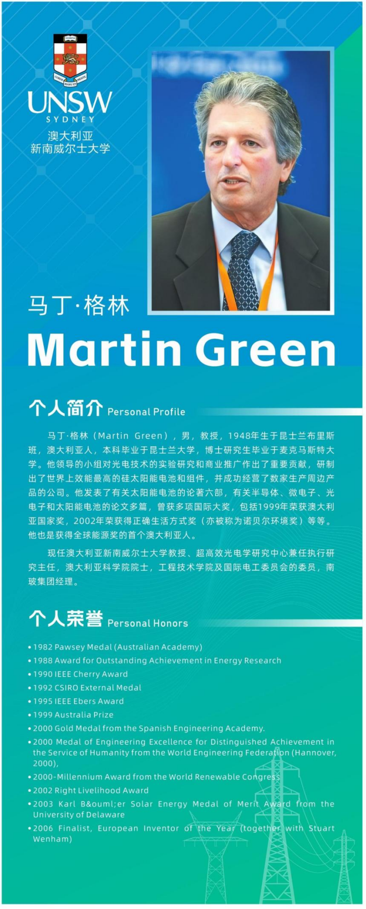 马丁·格林(Martin Green),男,教授,1948年生于昆士兰布里斯班,澳大利亚人,本科毕业于昆士兰大学,博士研究生毕业于麦克马斯特大学。他领导的小组对光电技术的实验研究和商业推广作出了重要贡献,研制出了世界上效能最高的硅太阳能电池和组件,并成功经营了数家生产周边产品的公司。他发表了有关太阳能电池的论著六部,有关半导体、微电子、光电子和太阳能电池的论文多篇,曾获多项国际大奖,包括1999年荣获澳大利亚国家奖,2002年荣获得正确生活方式奖(亦被称为诺贝尔环境奖)等等。他也是获得全球能源奖的首个澳大利亚人。