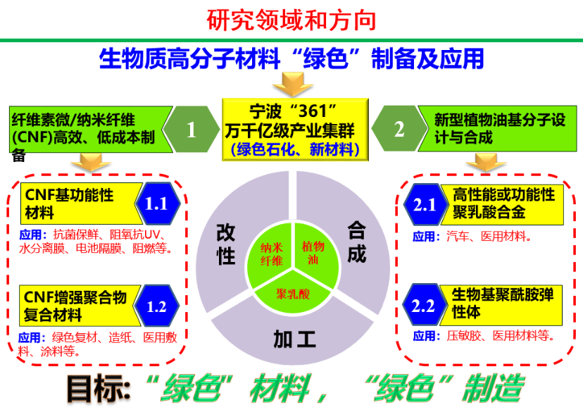 面向宁波经济社会发展的重大需求和国际学科基础研究前沿,结合化学合成、材料改性及加工手段,通过学科交叉、协同创新、产学研结合方式,聚焦纤维素微/纳米纤维工业化制备、高值化应用和“绿色”、高性能植物油基高分子材料开发领域,开展基础、关键技术及集成示范研究。包括以下三个研究方向: