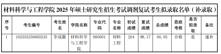 因公司材料工程专业(085601)拟录取考生俞胤杰(准考证号:100805180306414)主动放弃拟录取资格,根据《永利yl23411官网入口2025年硕士研究生招生复试录取工作办法》,现将拟补录取考生名单公示如下。公示期为2025年04月10日 - 2025年04月16日(七天)。公示期间,对拟录取名单有异议者,请实名向公司研究生招生办公室反映;如有违反党纪党规的行为,请向公司纪检监察室反映举报。